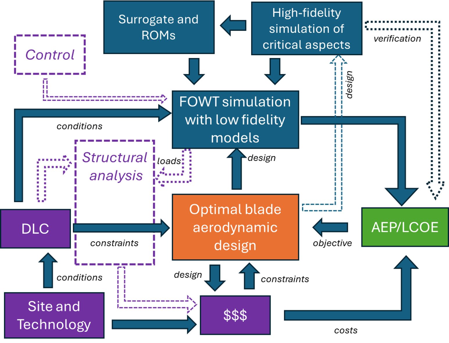 The project will optimize wind turbine blades and towers using multiple fidelity simulations. Airfoils will be refined to improve performance in Mediterranean conditions, and an optimization algorithm will tailor energy production, structural strength, and costs, including a focus on reducing the Levelized Cost of Electricity (LCOE) for floating platforms.
